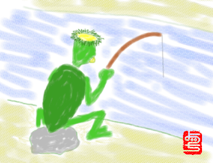 ピーマンを結びつけた釣り竿で釣りをしていたら、餌が流されたー!カッパに餌をとられたってことで決着。