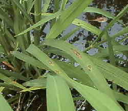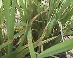 ![]() 葉イモチ病の病斑です。このくらいならまだ大丈夫。 |