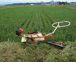 水を落とす時期になると水の出し入れをし易くするために田んぼに溝を切ります。 溝切り機を押して田んぼの中を歩き回ります。毎年のことながら重労働。ホントニタイヘンデス。 |